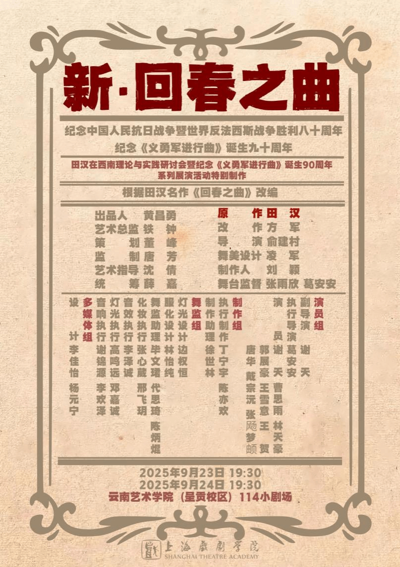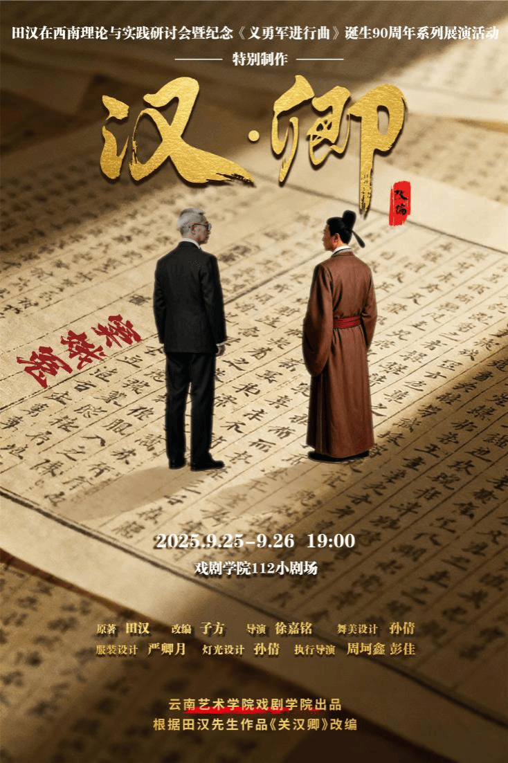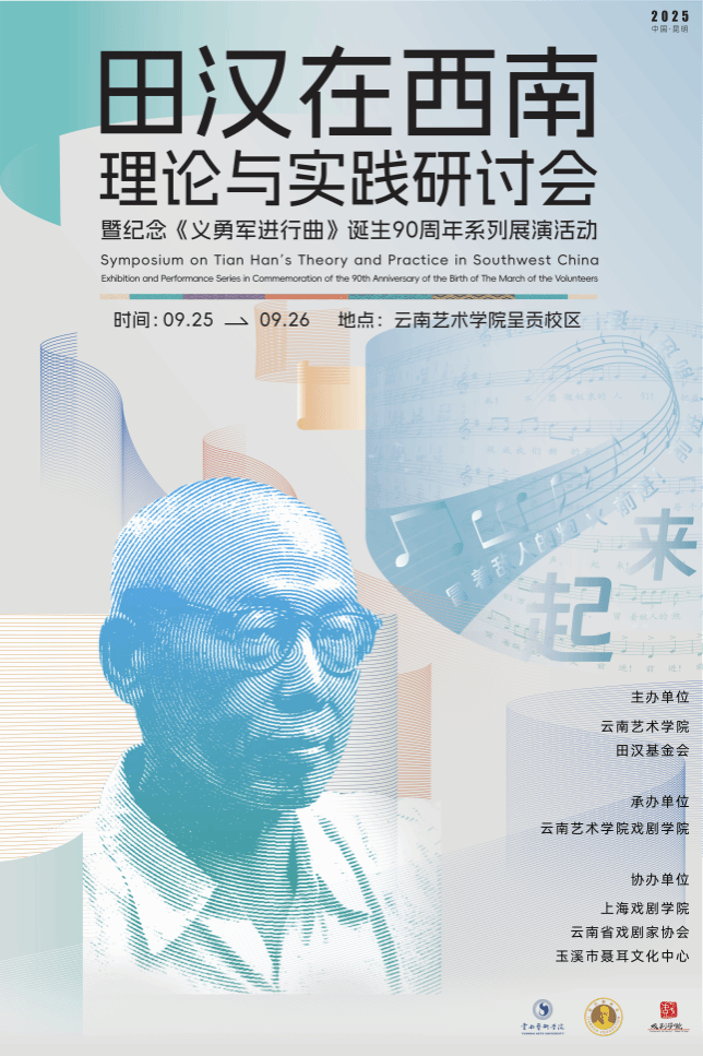 值此《义勇军进行曲》诞生90周年、抗日战争胜利80周年的重要历史节点之际,为继承和弘扬中国现代文学艺术的优秀传统,总结田汉先生在西南,特别是云南和昆明地区对我国文艺事业所作出的历史贡献,进一步促进艺术教育与学术研究的交流与发展,“田汉在西南理论与实践研讨会暨纪念《义勇军进行曲》诞生90周年系列展演活动”将于2025年9月25日至26日在学院隆重举办。