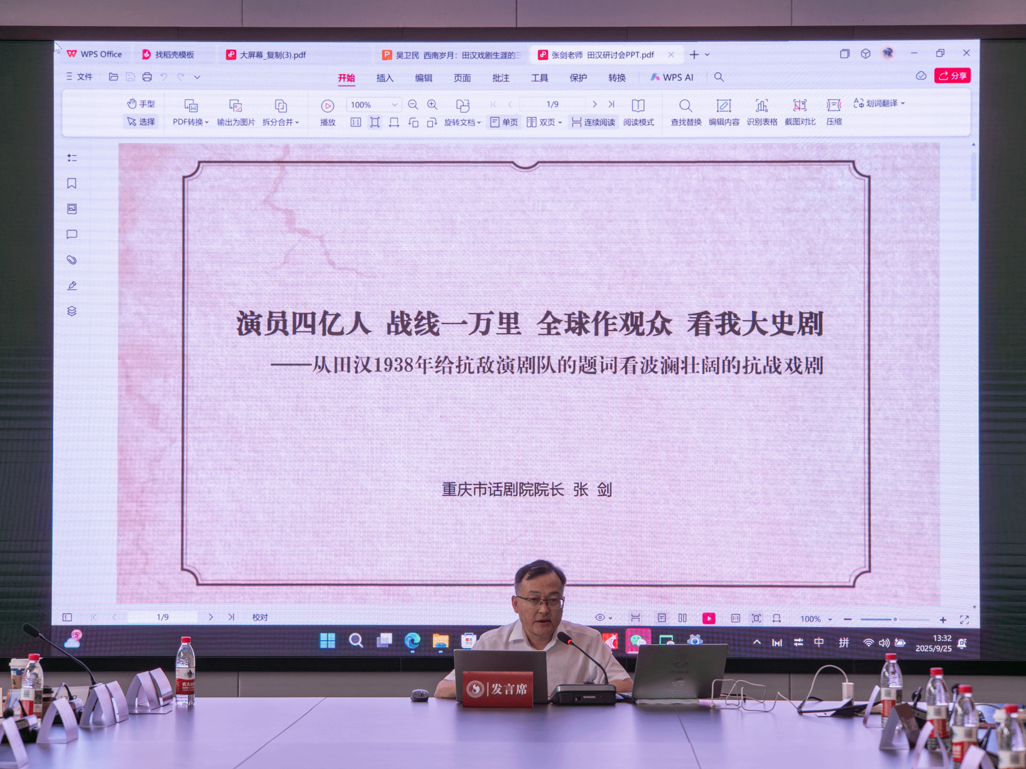 重庆市话剧院院长张剑以《演员四亿人,战线一万里,全球作观众,看我大史剧——从田汉1938年给抗敌演剧队的题词看波澜壮阔的抗战戏剧》为题,阐述了抗战戏剧的宏大格局。他提到,以重庆为中心的抗战戏剧运动,不仅在当时发挥了巨大的动员作用,更创造了中国话剧史上的“黄金岁月”。特别强调了田汉在组建演剧队、筹备“西南剧展”以及推动“抗建堂”成为话剧圣殿等方面的卓越贡献,彰显了戏剧在民族危亡时刻的文化力量。