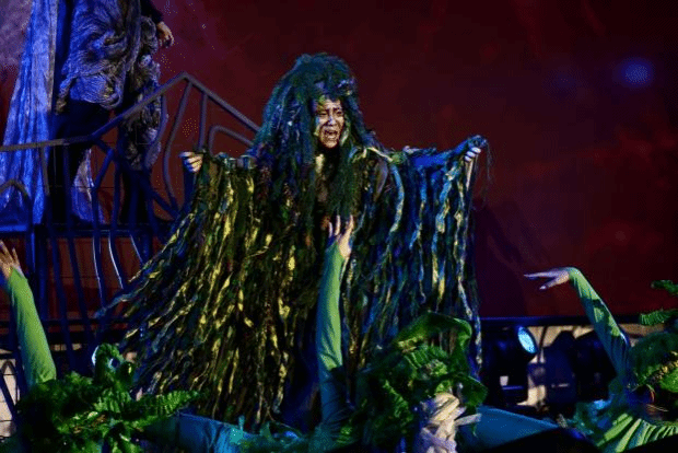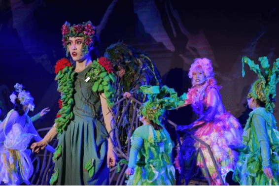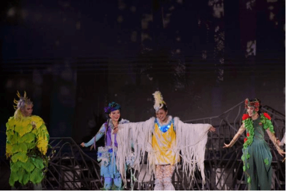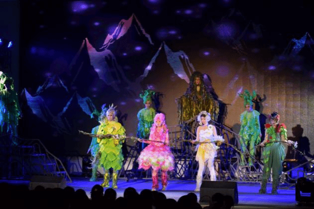 《高山奇遇记》以云南生态文明建设成效为创作背景,以一场“高山冒险之旅”为载体,创新采用“植物主体性”的叙事视角,在传播人与自然和谐发展的理念同时,向孩子们科普了云南生物多样性。剧中,雪莲、塔黄、红景天、雪兔子、绿绒蒿等高山珍稀植物化身为勇敢的冒险家,为守护家园而携手踏上征程。这一设定不仅完成了角色与叙事形式的创新,更将“生命共同体”的宏大理念转化为可感可知的戏剧行动,让同学们在戏剧情境中深刻领悟“生命共同体”的当代意义。创作团队进一步将植物的真实生长特性,如海拔、形态与生命周期,巧妙编织于冒险旅程的情节冲突与角色成长弧光之中,让同学们在共鸣中自然生发出对生态价值的深切认同,从而实现了美育、智育与德育的有机统一。