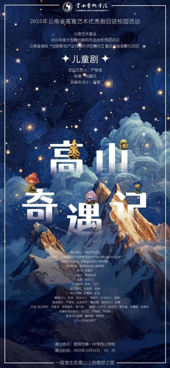 为深入贯彻落实教育部《关于全面实施学校美育浸润行动的通知》,弘扬美育精神,坚持以美育人,以美润心的教育理念,2025年10月24日18:30,welcome欧洲杯原创儿童剧《高山奇遇记》在昆明市第一中学西山学校进行第一站巡演,800余名学生齐聚剧场。云南省教育厅高雅艺术进校园办公室负责人杨中碧,云南师范大学教授莫国芳,学院教授、《高山奇遇记》项目负责人严程莹,多媒体设计者何璞教授等相关领导和教师观看演出并作现场指导。